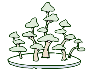)The forest style looks a lot like the multi-trunk style, but the difference is that it is comprised of several trees rather than one tree with several trunks. The most developed trees are planted in the middle of a large and shallow pot. On the sides a few smaller trees are planted to contribute to one single crown. The trees are planted not in a straight line but in a staggered pattern, because this way the forest will appear more realistic and natural.